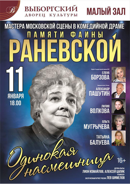 Мастера московской сцены в комедийной драме памяти Фаины Раневской. Смешная и грустная история в двух частях. Неповторимый, не придуманный авторами, а подлинный юмор Фаины Раневской, самые яркие её образы, самые смешные её анекдоты, самые меткие её афоризмы, самые трагикомические моменты её судьбы. Время действия — последний год жизни великой актрисы и человека. Место действия — её московская квартира. Вам будет весело, но…