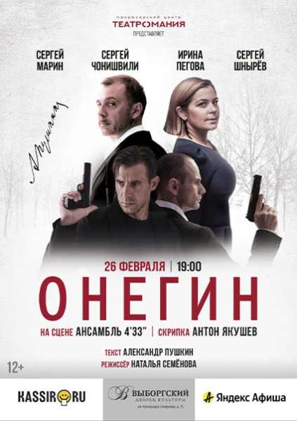 В нашей версии «Онегина» представляют интереснейшие актеры и музыканты: Сергей Чонишвили, Ирина Пегова, Сергей Марин, Сергей Шнырёв. На сцену вместе с актерами выходит ансамбль «4:33». Специально для проекта снято кино.