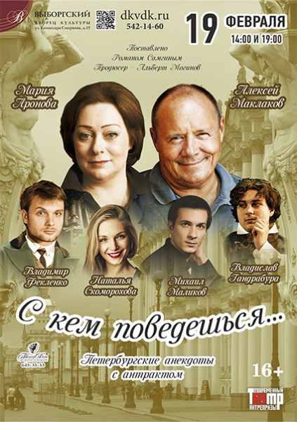 «С кем поведешься…» — это серия комичных зарисовок, наполненных искрометным юмором, переносящих зрителя в Петербург 19-го века! Наблюдая за колоритными персонажами, легко понять: несмотря на время и изменения, суть русского человека осталась прежней, а вопросы, волновавшие героев в 19 веке, актуальны и по сей день. Тонкий юмор, динамика, колорит дореволюционного Петербурга. Песни, танцы и бесподобная игра любимых актеров!