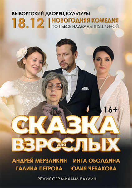 Спектакль «Сказка для взрослых» — это праздничное настроение, искрометный, но деликатный юмор и романтическая нежность. Это история о том, как случайная встреча может стать судьбой, о том, что в любом возрасте можно встретить любовь. Блестящий состав любимых артистов, динамичный сюжет и забавные приключения сделают ваш вечер незабываемым!