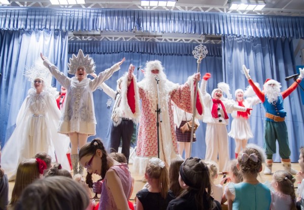 После спектакля дети получают подарки из рук главных персонажей и фотографируются с ними и Дедом Морозом со Снегурочкой.