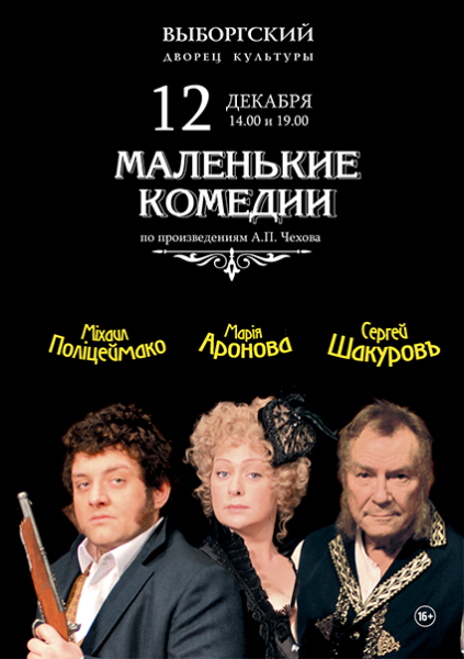 В основу спектакля легли два замечательных произведения А. П. Чехова «Медведь» и «Предложение». Сказать, что это смешно, не сказать ничего. И не важно, любите ли вы Чехова столь же горячо, как любят его завзятые театралы, — на этом спектакле вы будете хохотать через десять минут после начала и сможете спокойно вдохнуть только после выходов на поклон под нескончаемые аплодисменты зала. В этом спектакле совпало всё: феноменальное разнообразие человеческих типов, сыгранных в двух действиях одними и теми же актерами, демонстрирующими огромный диапазон характеров, диаметрально противоположных по сути. В двух смешных историях, рассказанных Чеховым, гротескный, абсурдный диалог персонажей перерастает в дуэль, которая становится поединком сердец. В спектакле, поставленном Алексеем Кирющенко — одним из лучших комедиографов наших дней, зрителей привлечет динамичная интрига и разнообразие проявлений человеческих качеств — от тяжеловесного хамства к проникновенной лирике.